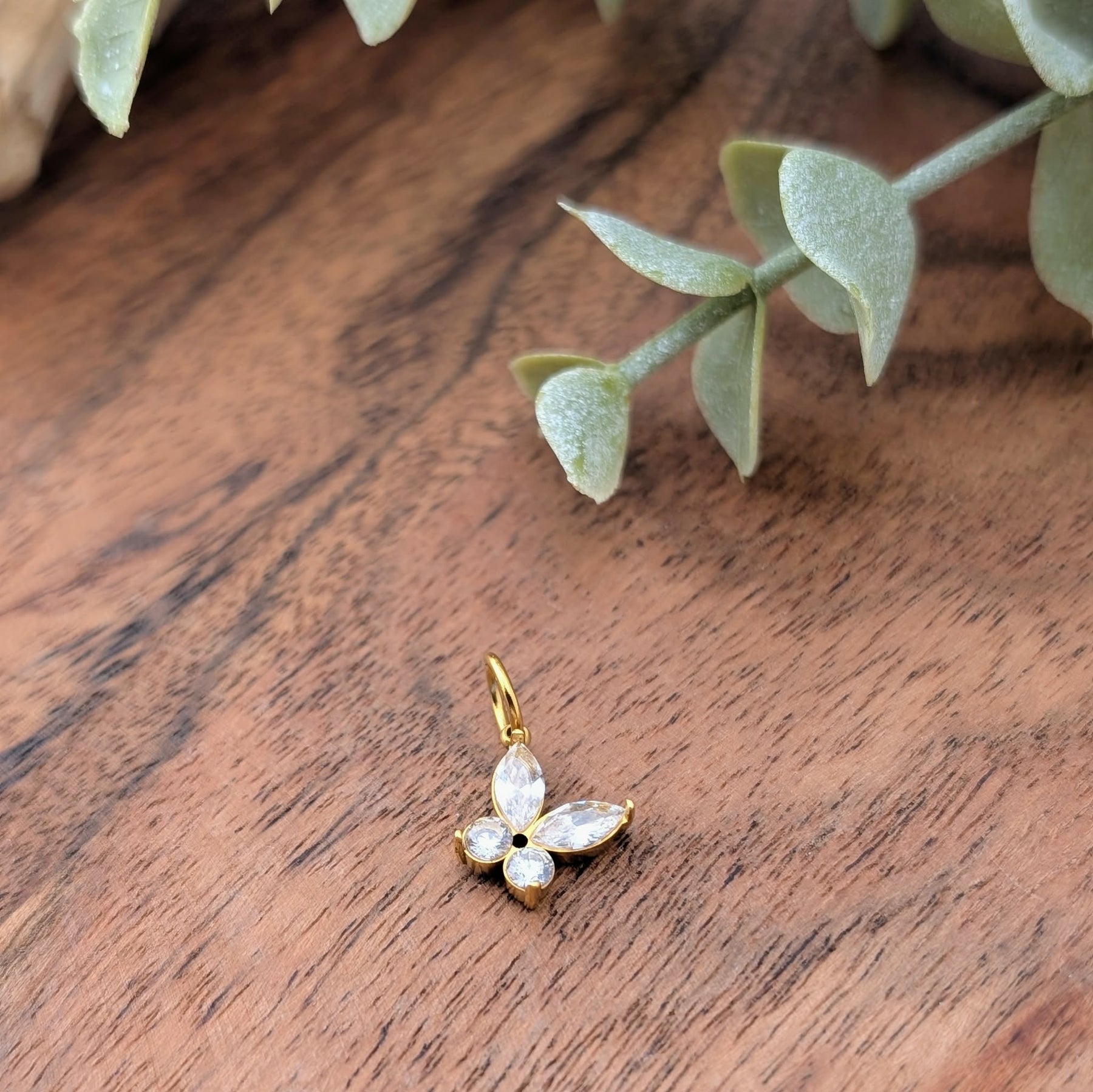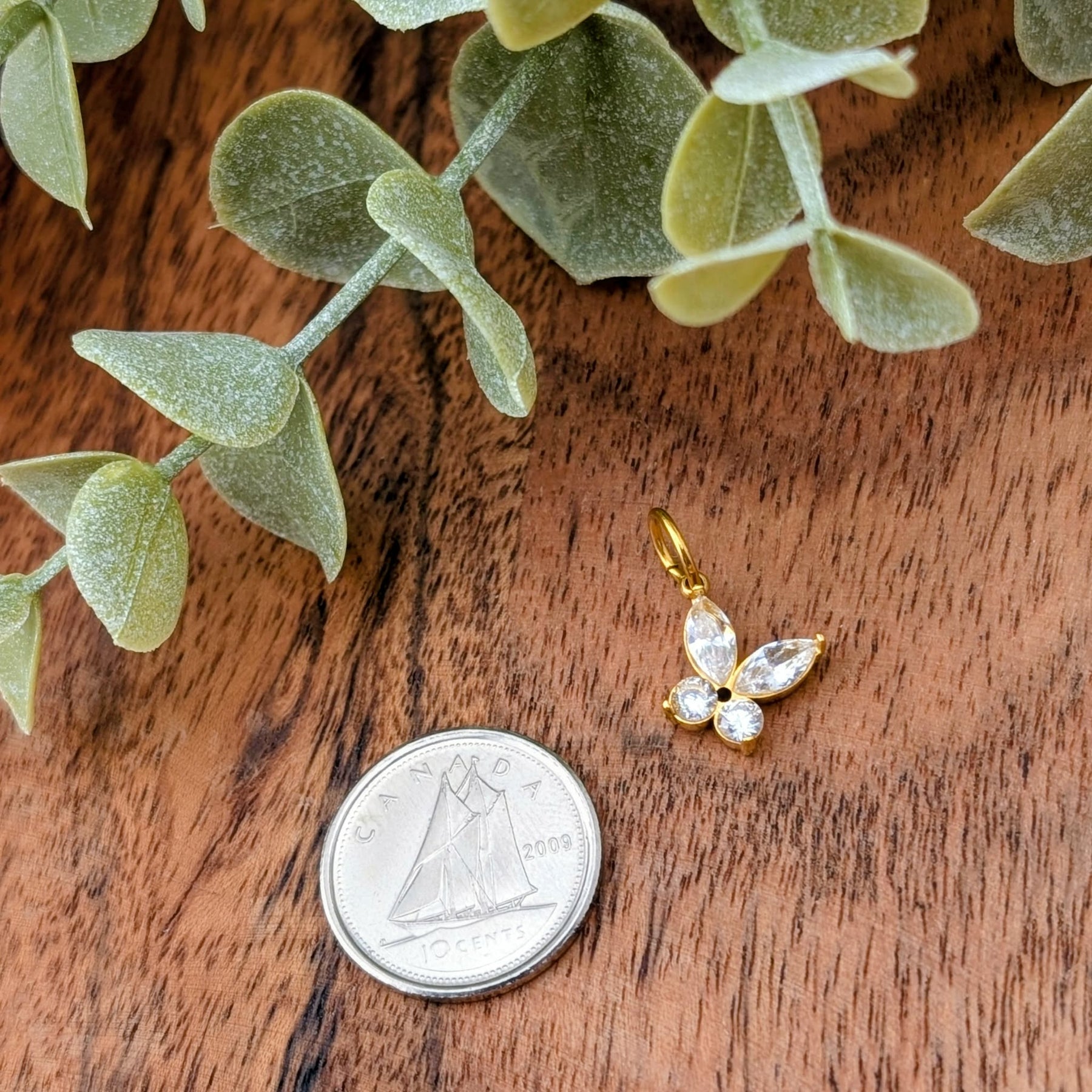 Breloque de papillon style diamant en acier inoxydable et de couleur doré avec large anneaux.