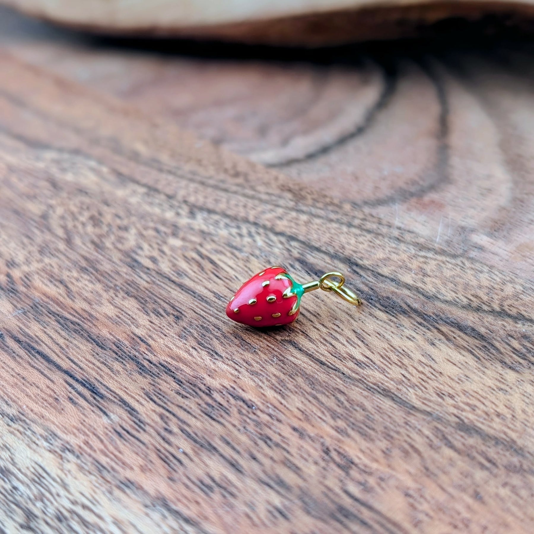 Breloque de petite fraise rouge fait d'acier inoxydable.