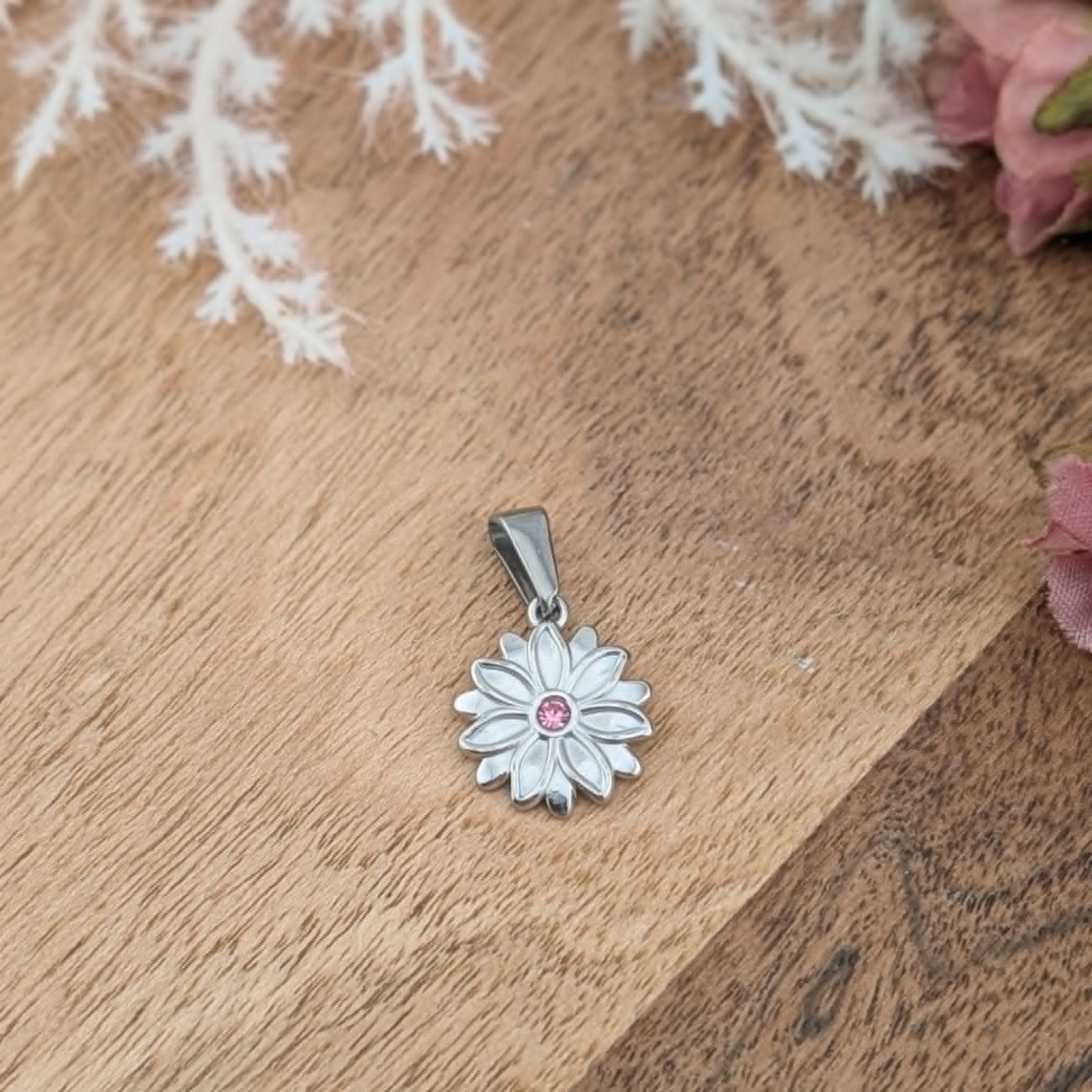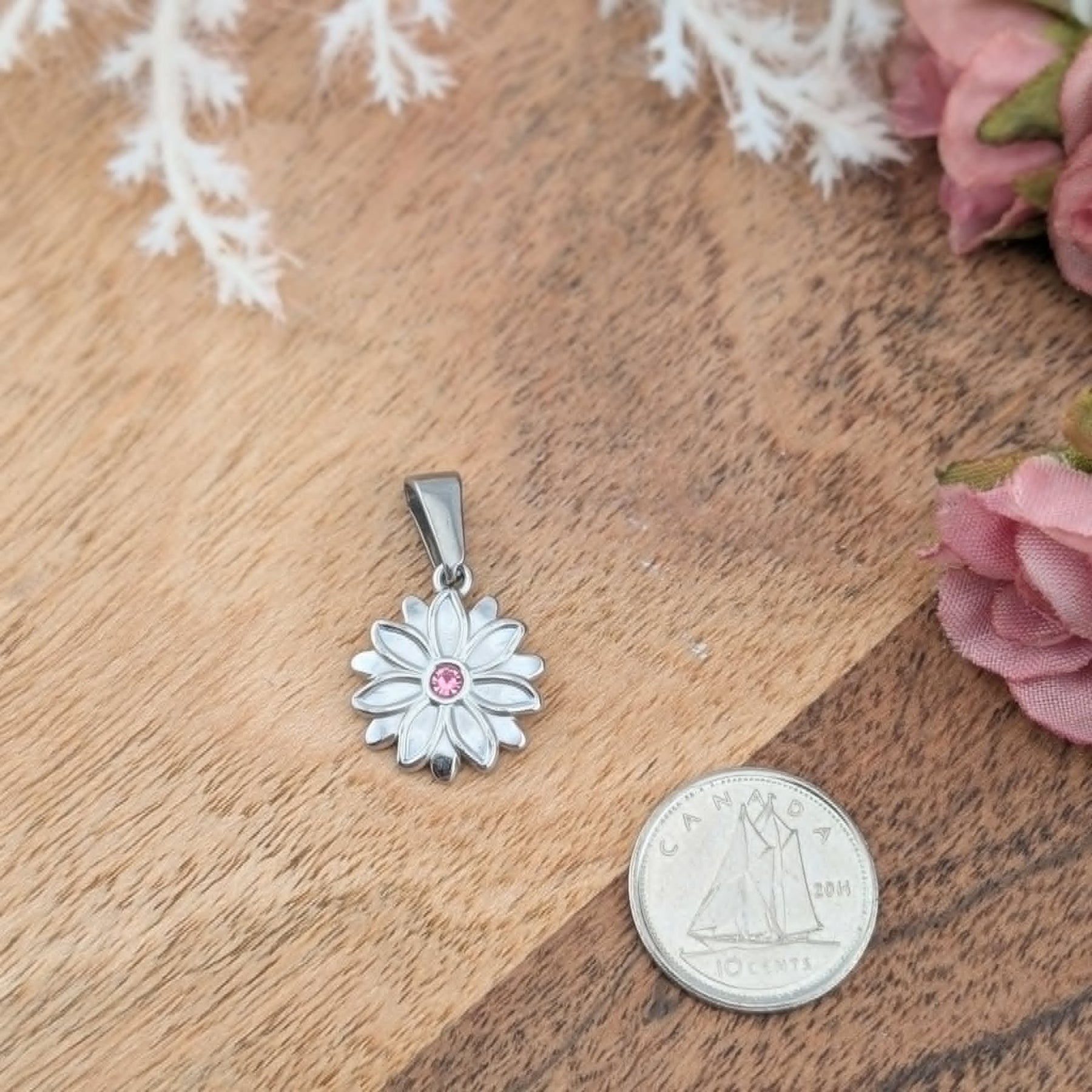 Breloque fleur de style marguerite au centre brillant et rose, comme si vous portiez le printemps à votre cou!