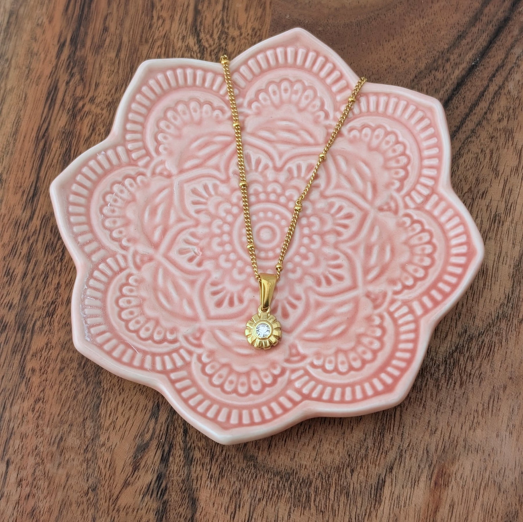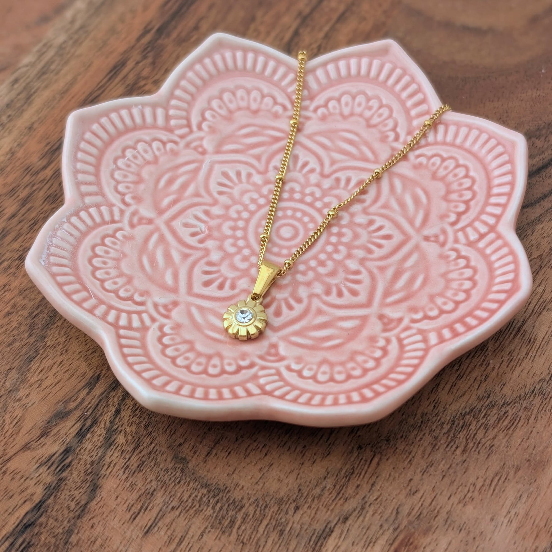 Pendentif fleur de strass complètement en acier inoxydable et de couleur doré.
