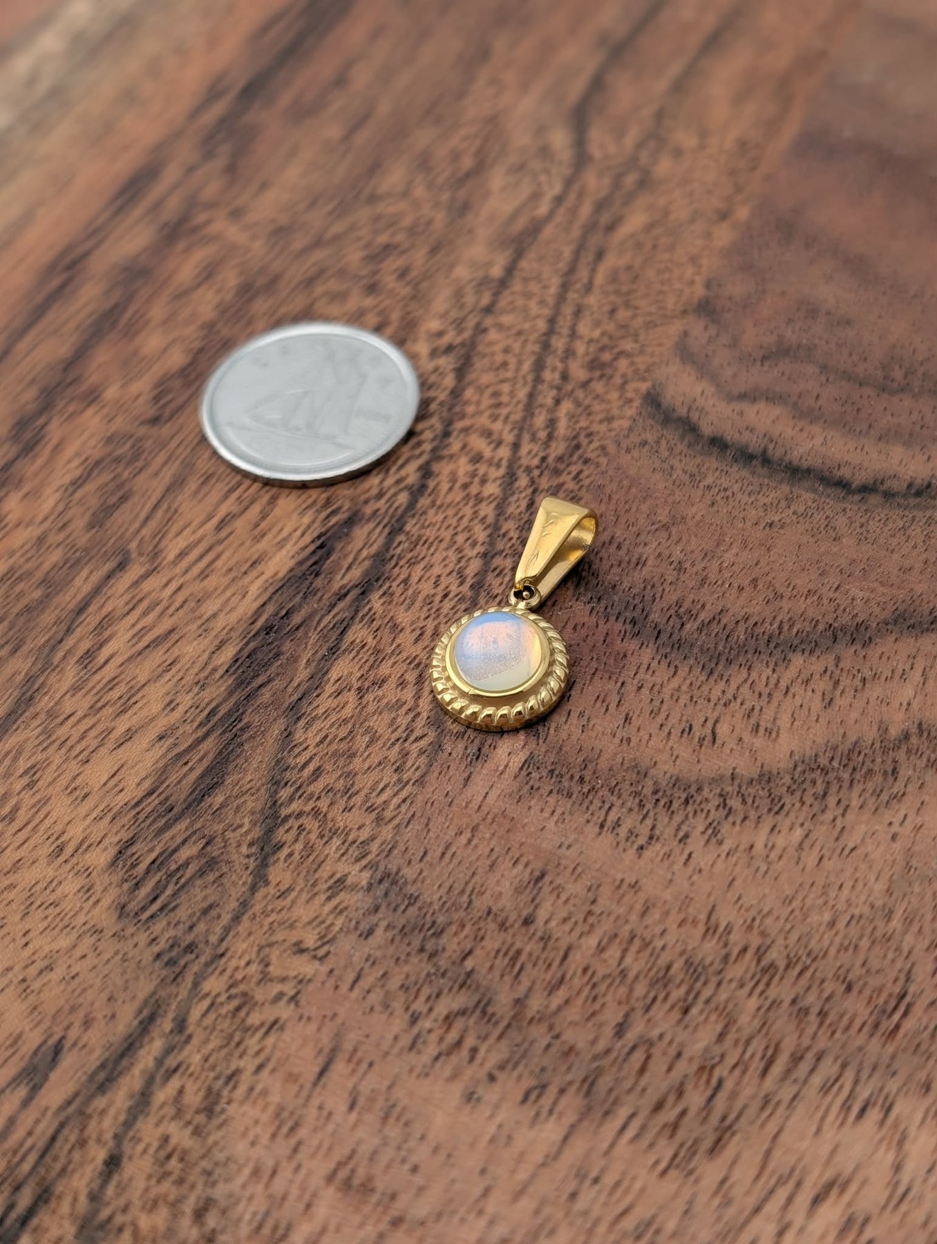 Pendentif opalite rond complètement en acier inoxydable et de couleur doré.