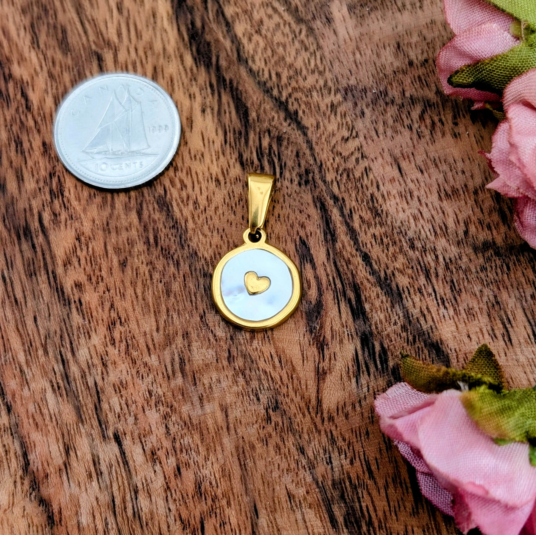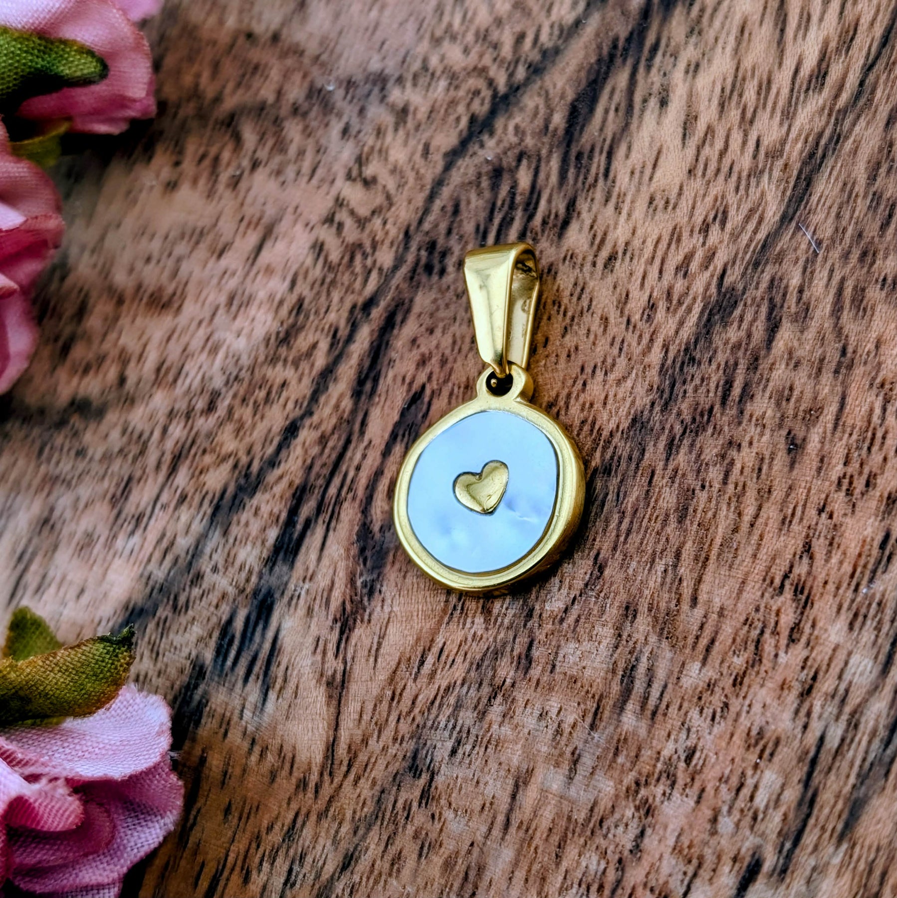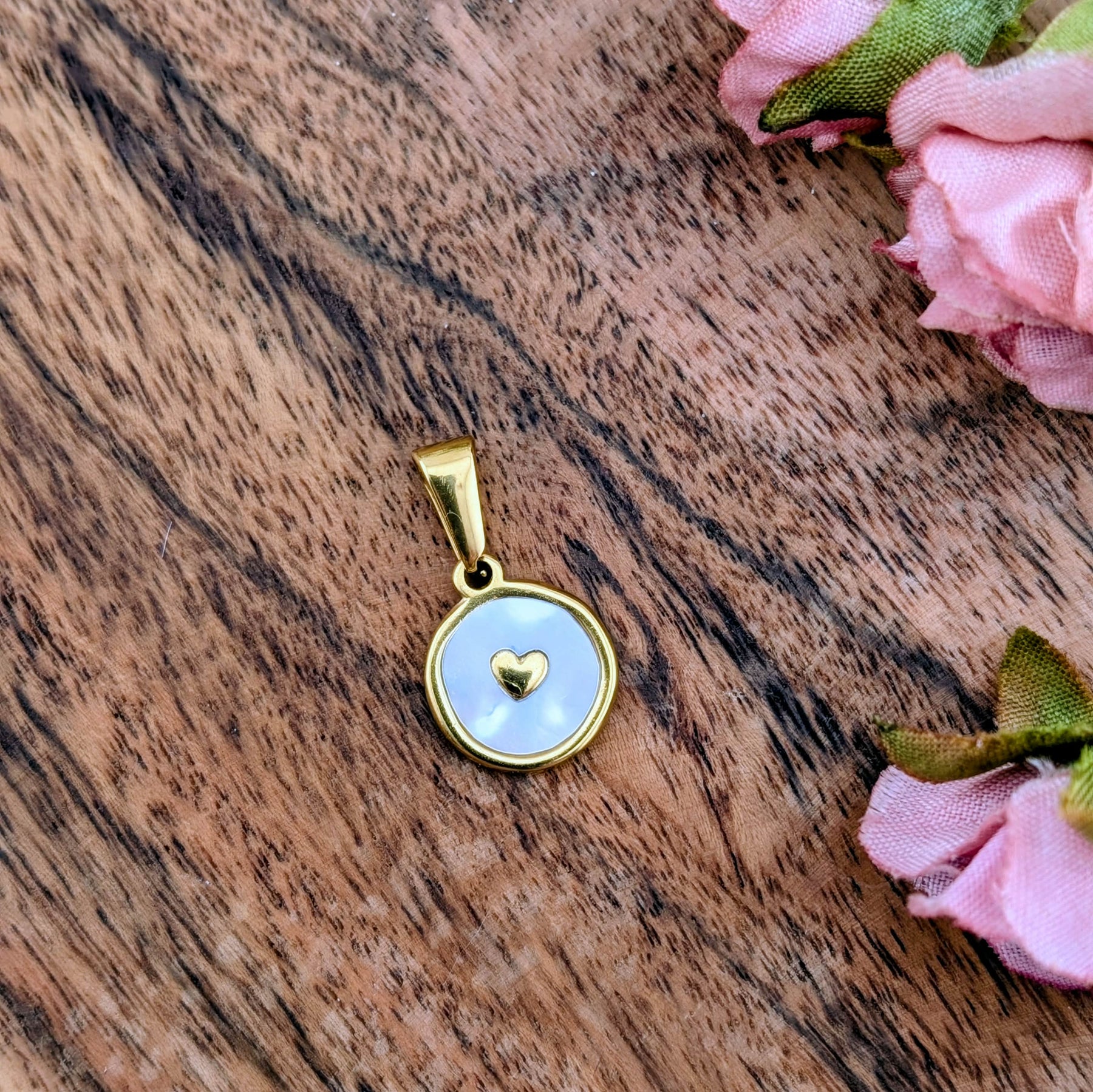 Médaillon petit coeur d'or avec du nacre blanc monté sur une base en acier inoxydable de couleur doré.