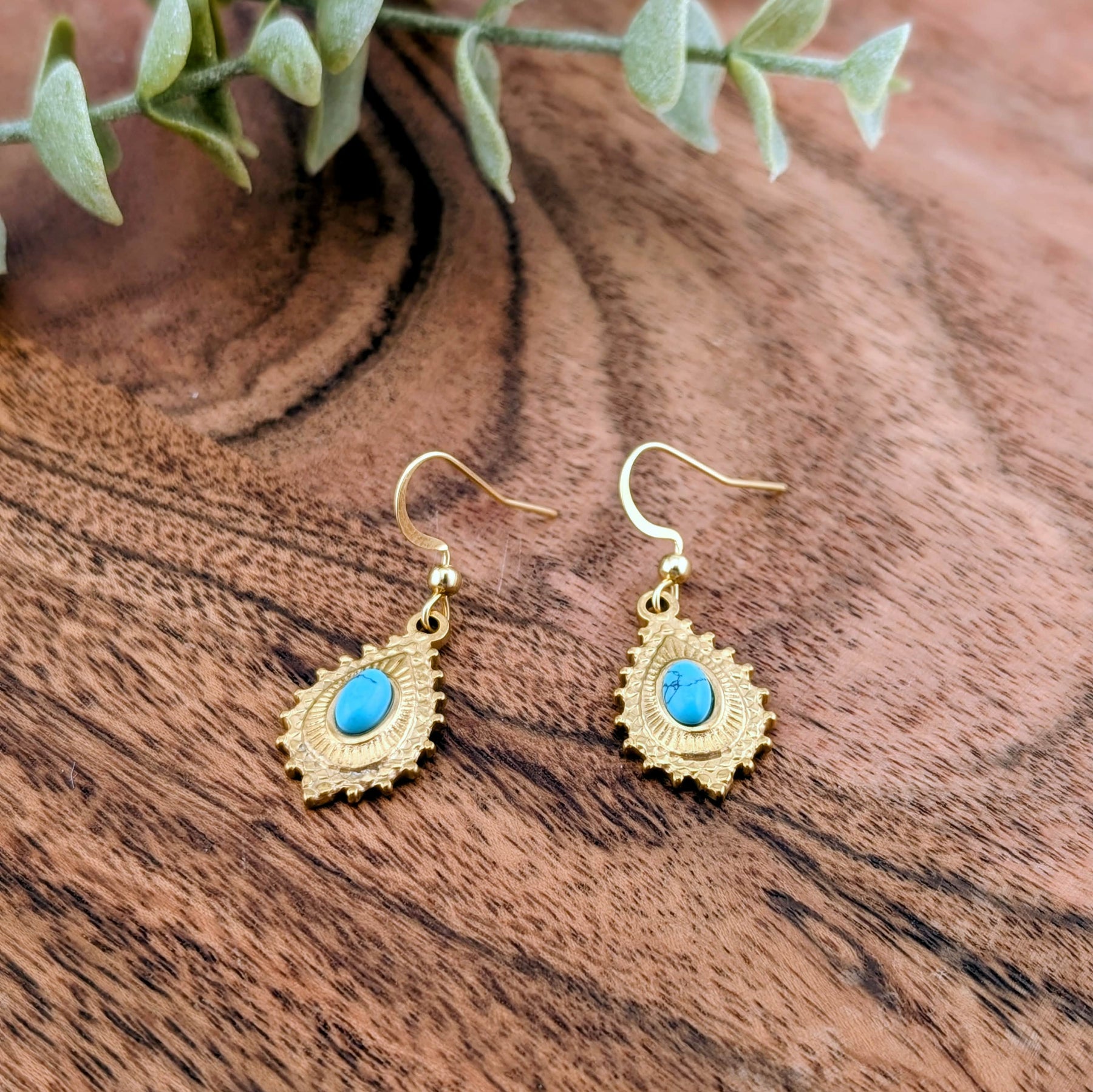 Boucle d'oreille avec jolie pièce en acier inoxydable surmonté d'une petite pierre de turquoise ovale fait d'acier inoxydable.
