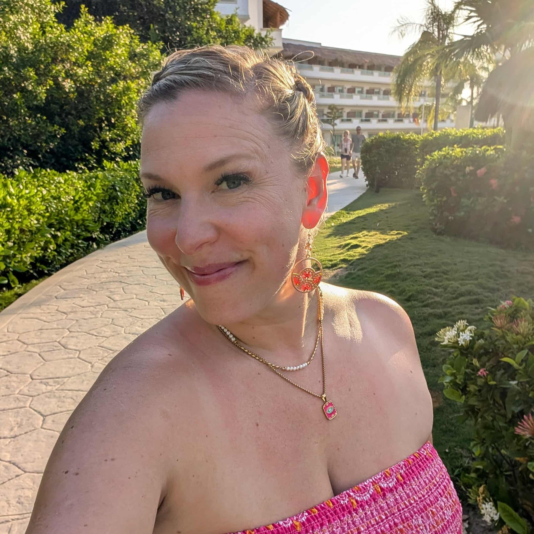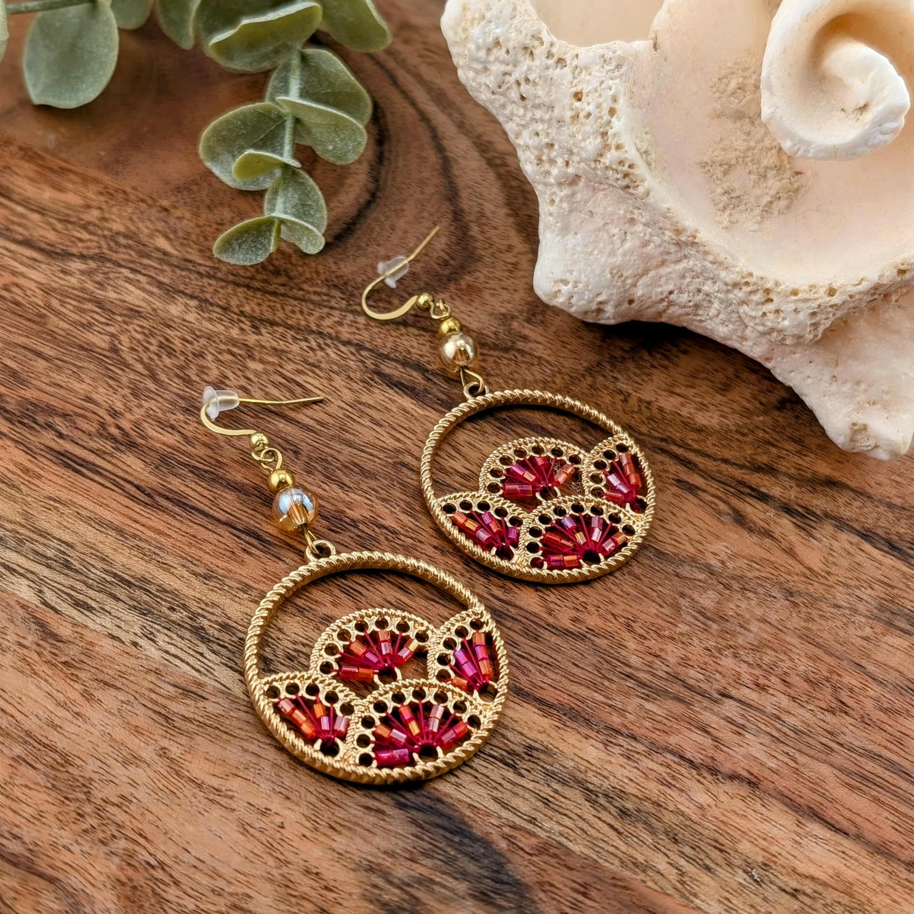 Boucles d’oreilles tissées sur une base dorée avec des petites pierres rouge brillantes