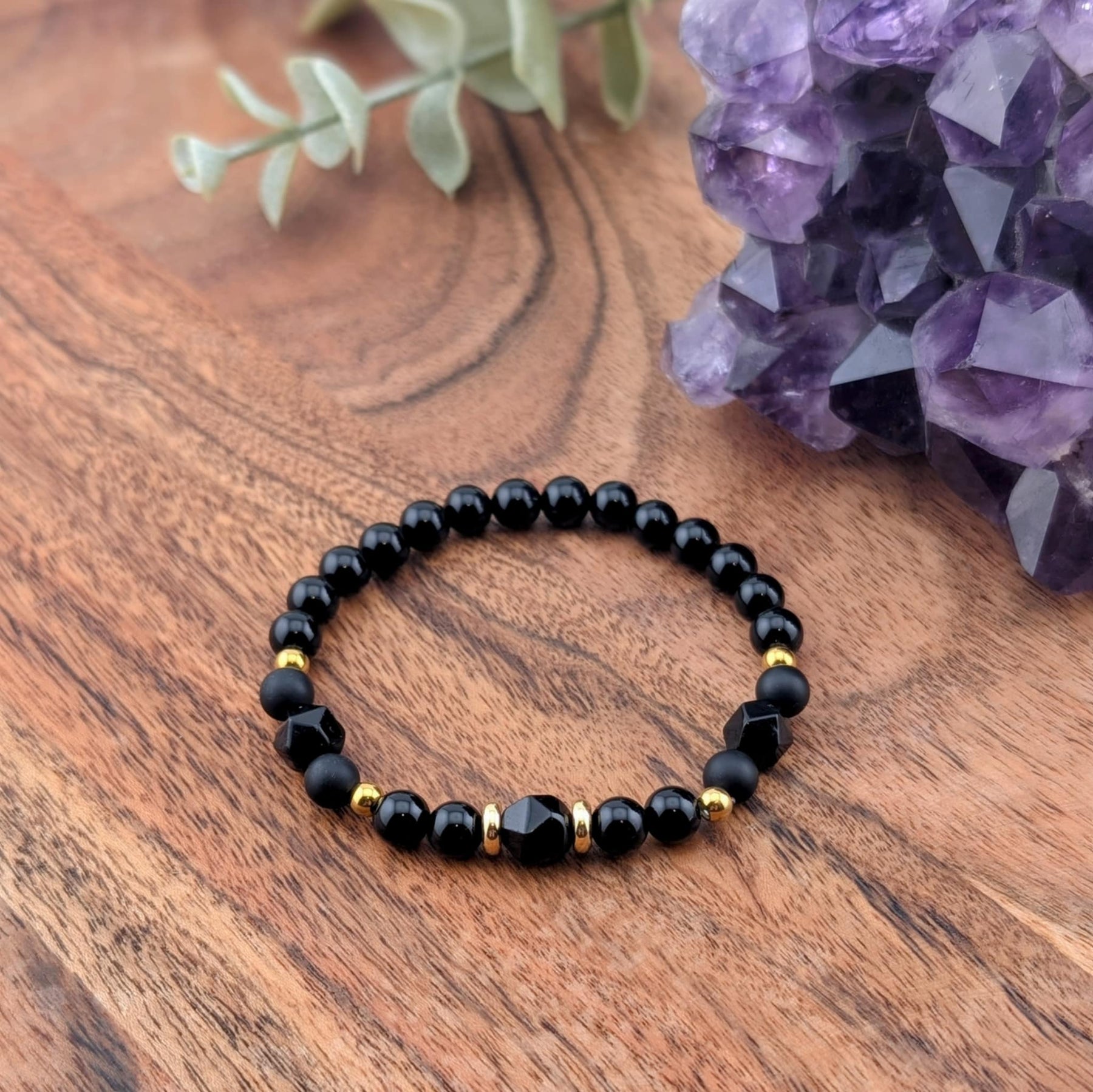 Trio of bracelets made of 4.6 and 8 mm semi-precious stones of gold-tinted aura quartz, smoky quartz, raw blue-green quartz, blue-green metallic hematite, green goldstone and yellow tiger's eye.