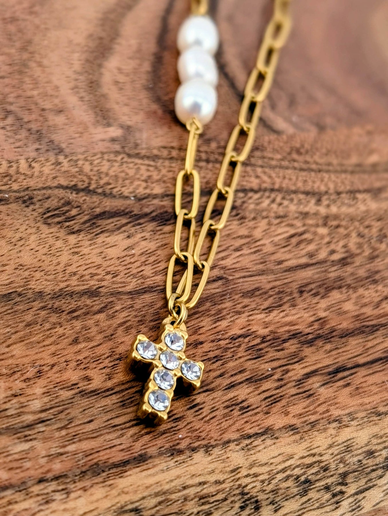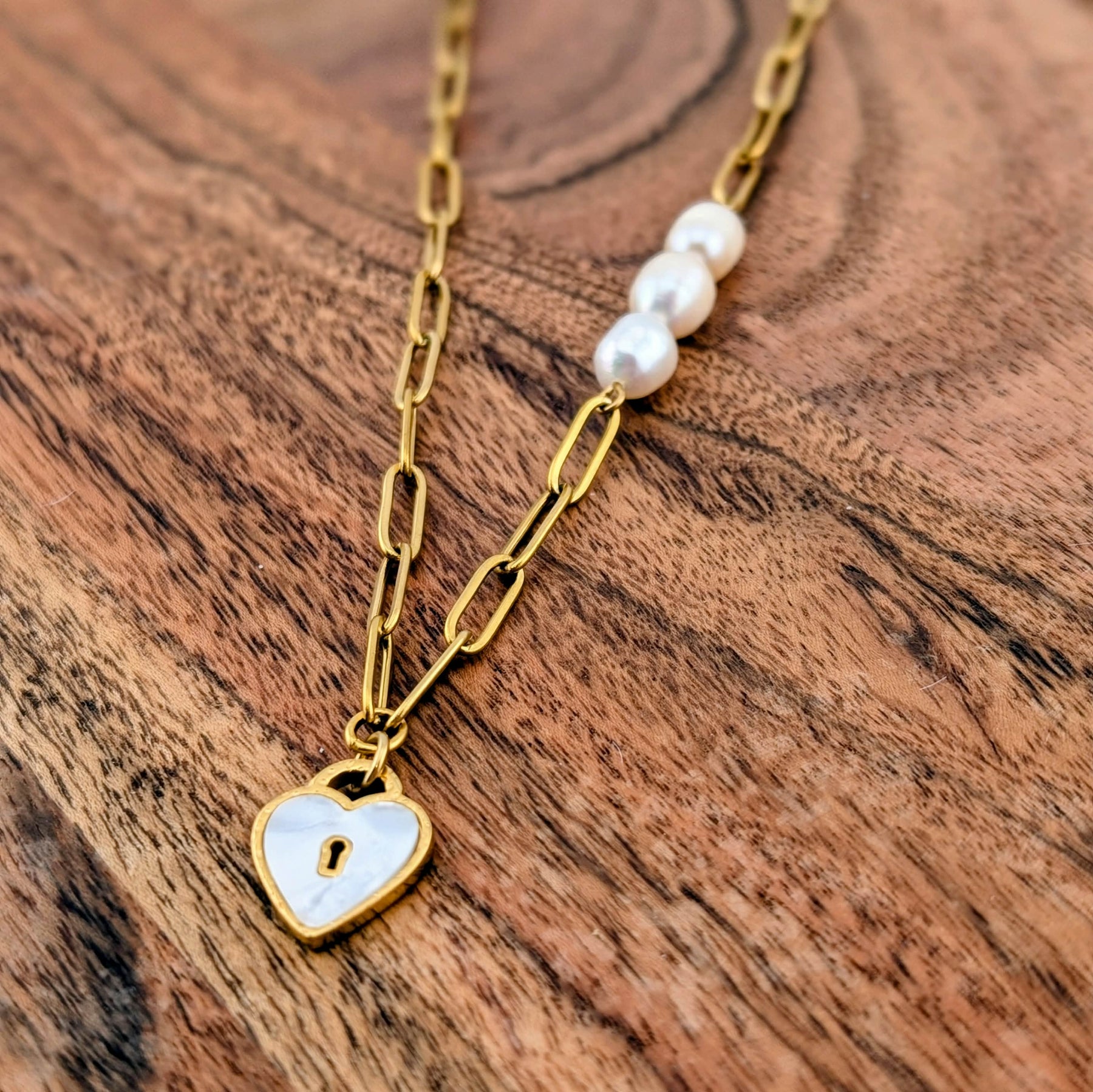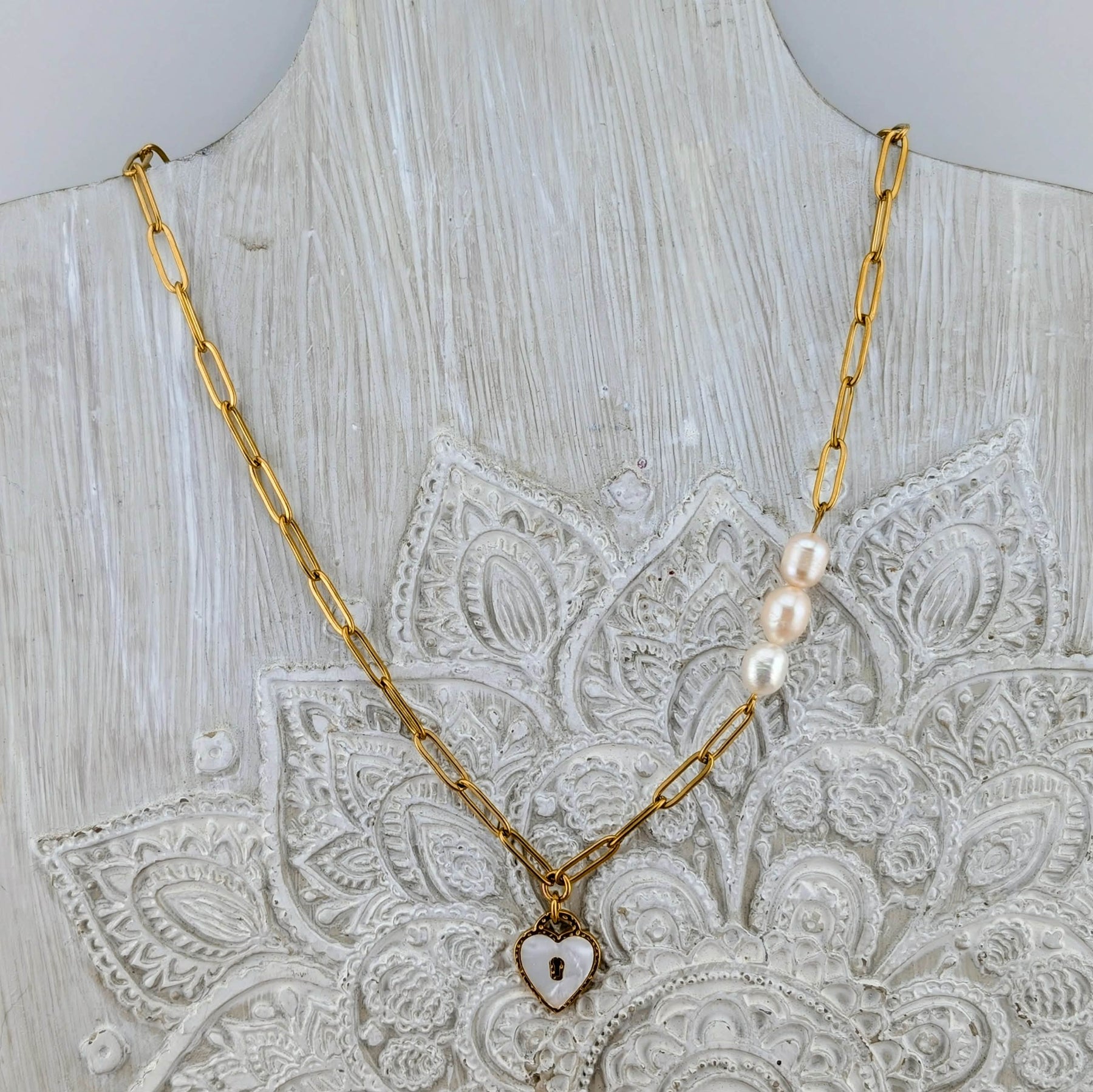 Beautiful pale pink textured shell bead necklace, arranged with faceted Czech glass beads and gold cube inserts, mounted on 18" long nylon covered steel wire, fitted with a gold chain extender 2 inches.