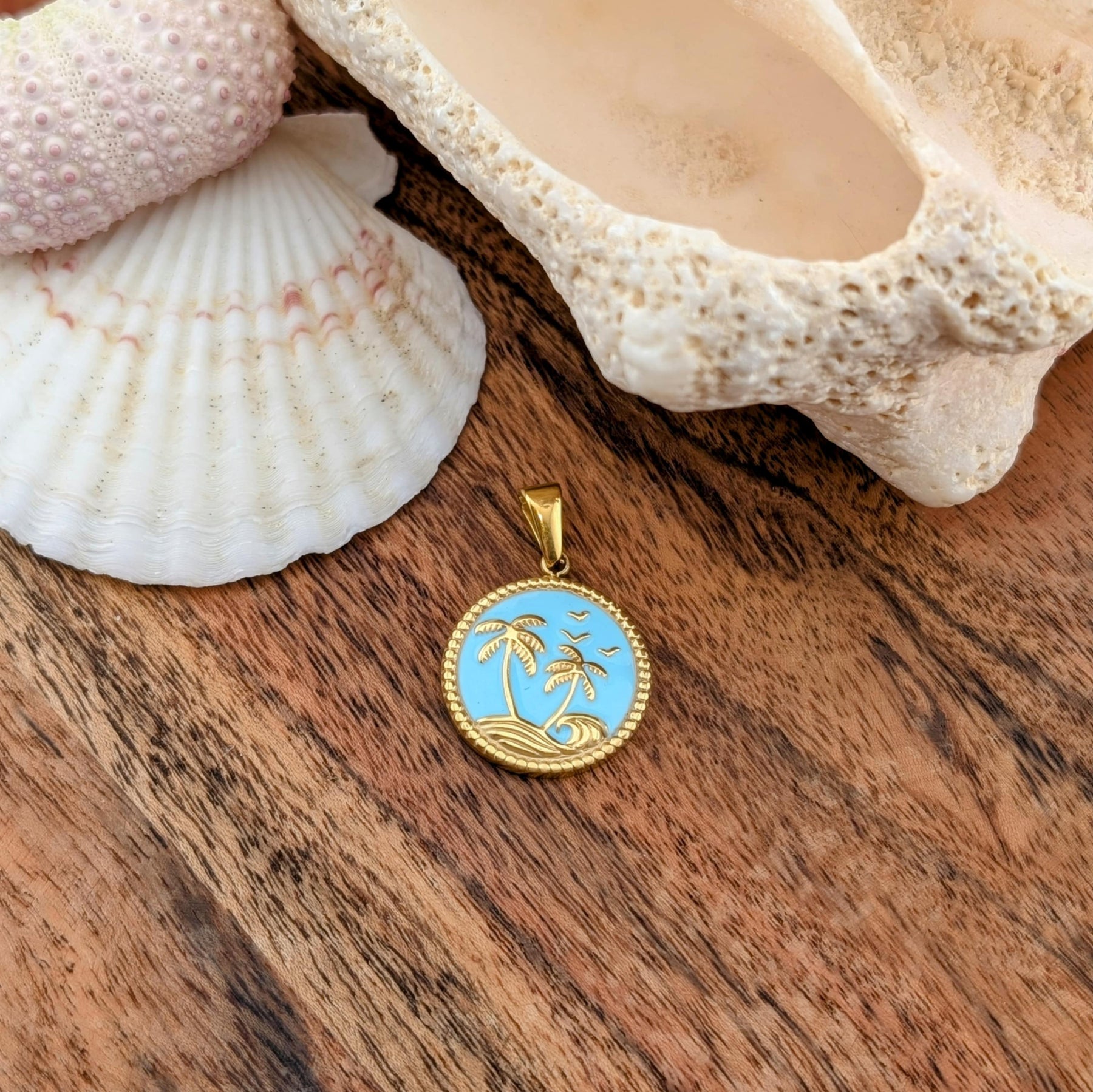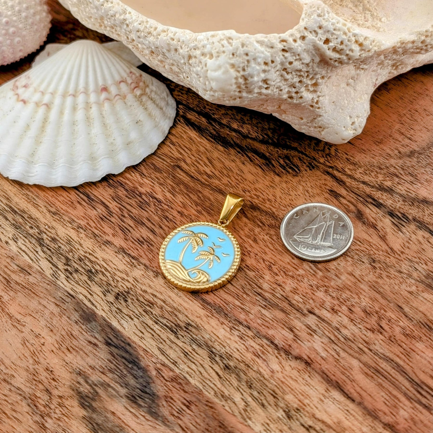 Breloque ronde de paradis sur terre bleu pastel et doré fait d'acier inoxydable avec deux jolies palmier et une vague.