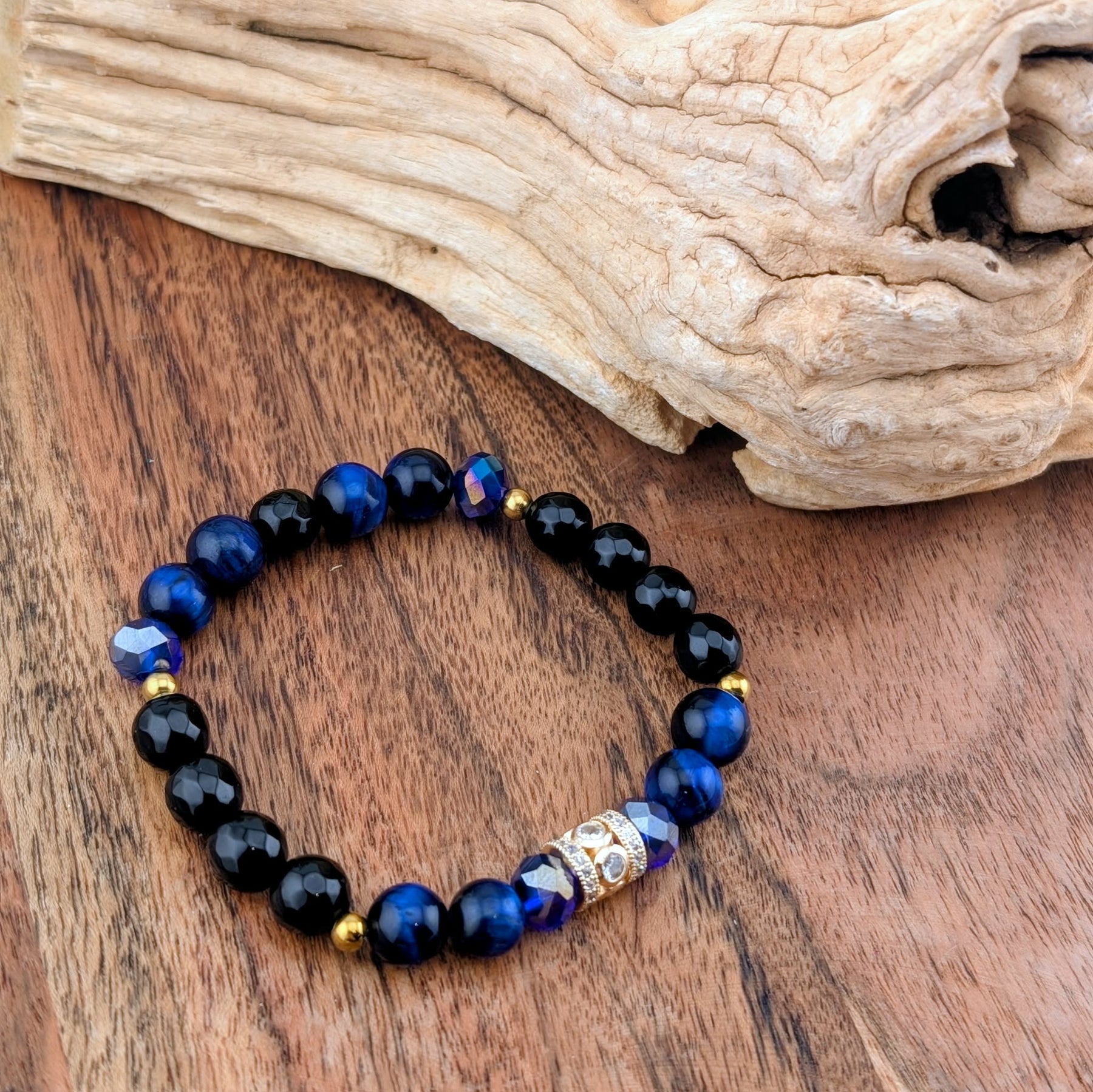 Boucles d'oreilles hypoallergénique fait de crystaux de verrre bleu brillant avec une touche d'hématite doré.