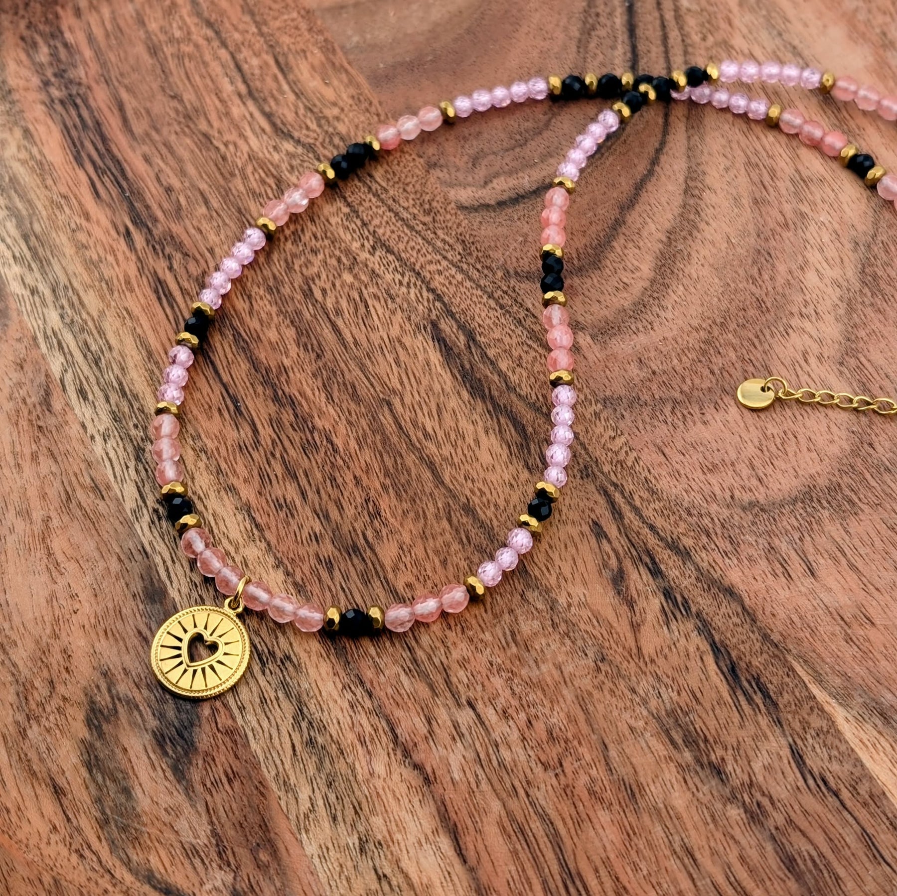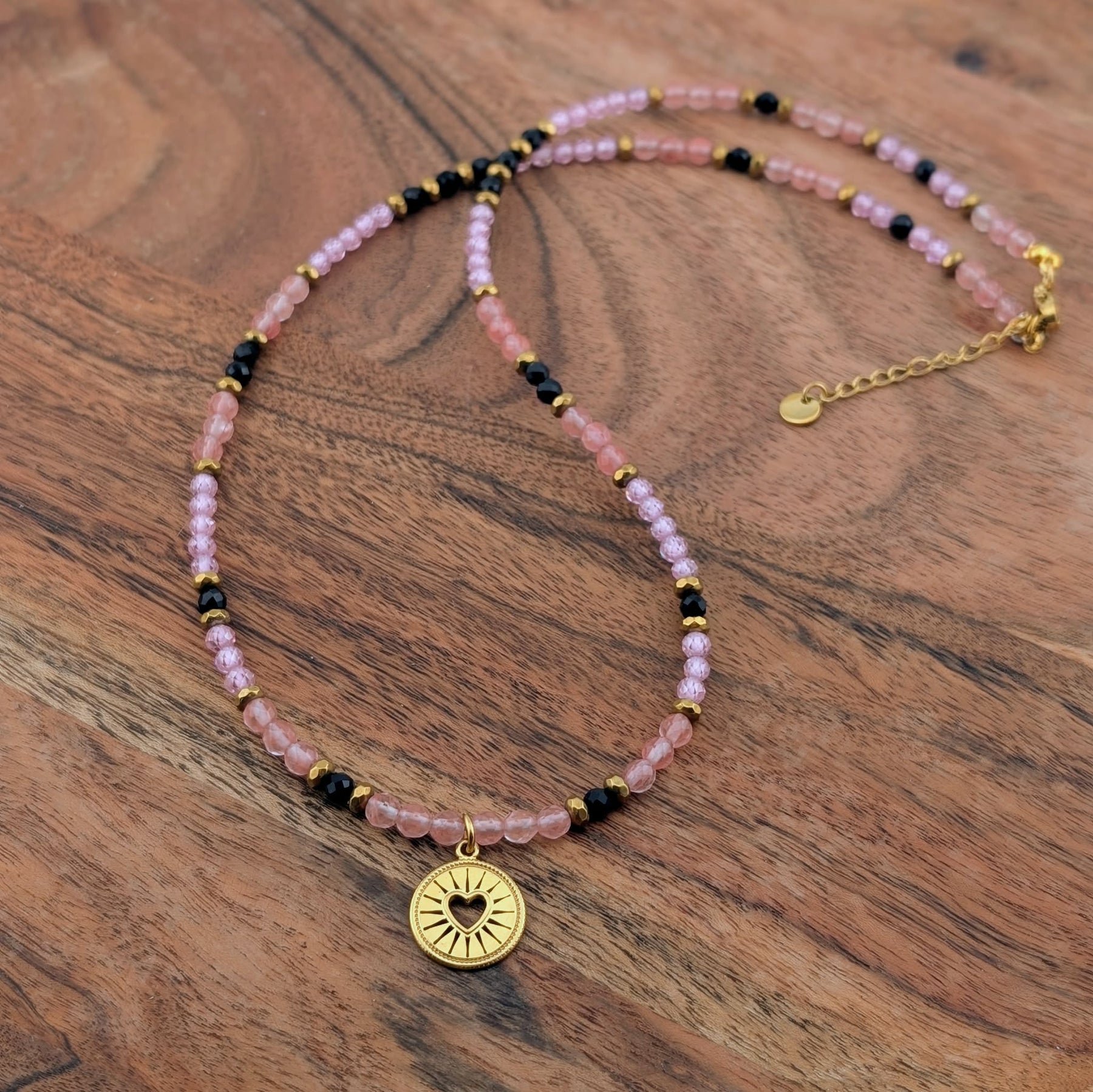 Collier l'artiste s'amuse rose et noir avec breloque de coeur rayonnant