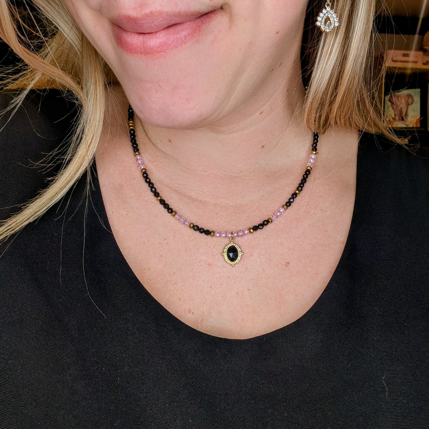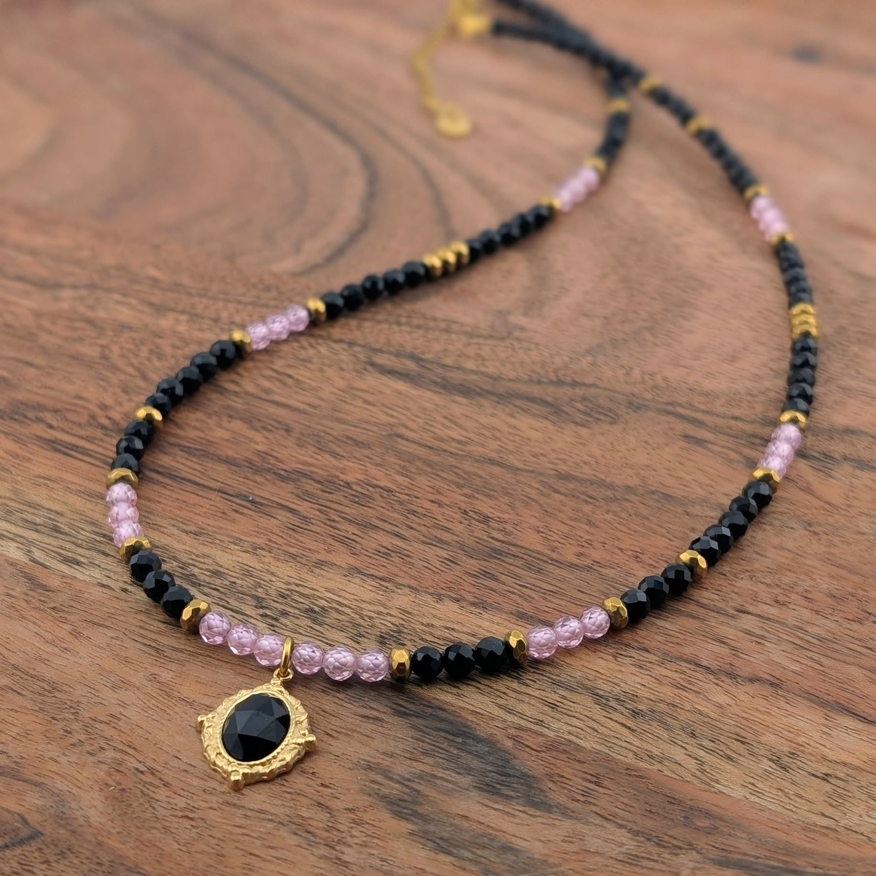 Collier l'artiste s'amuse rose, noir et doré avec un camé d'onyx