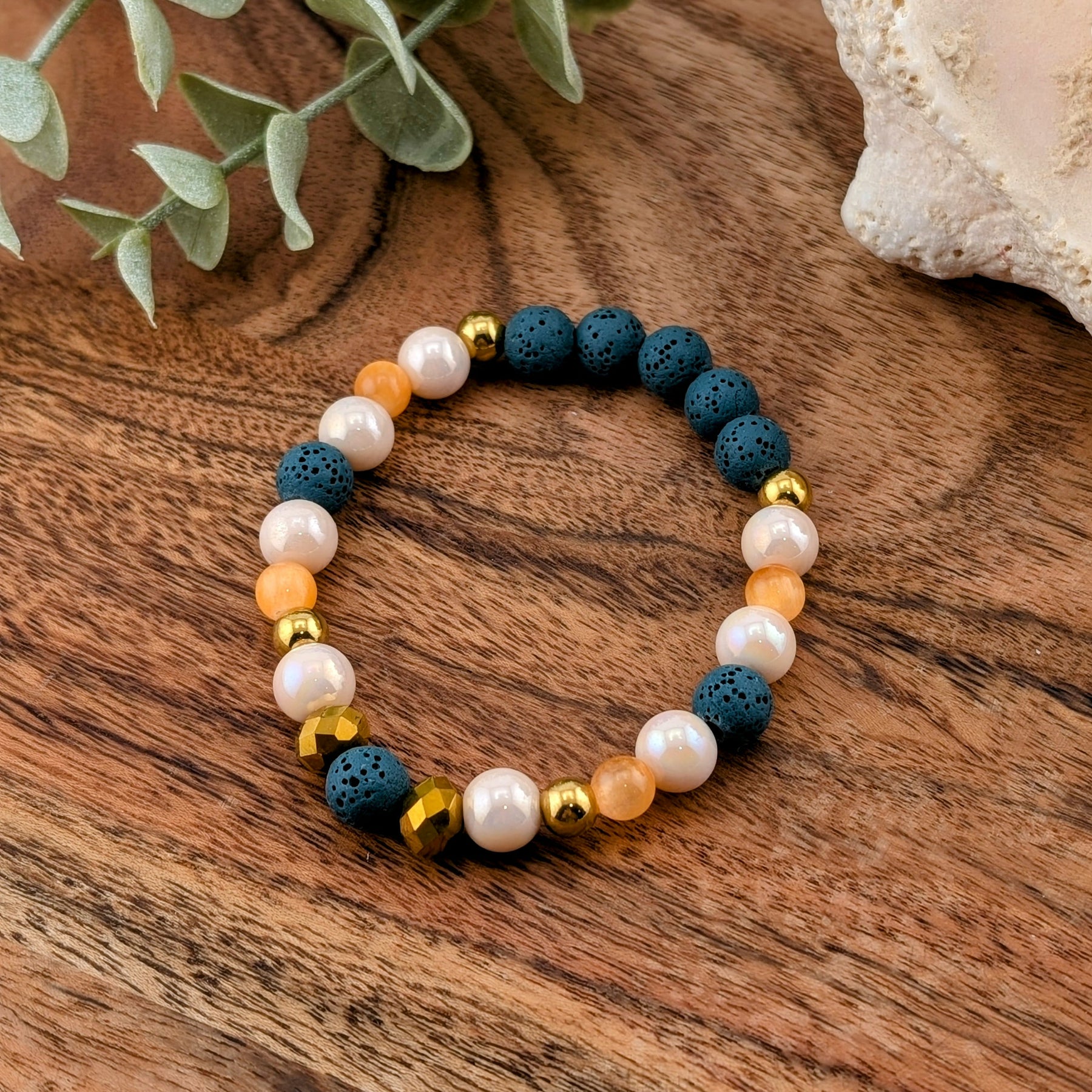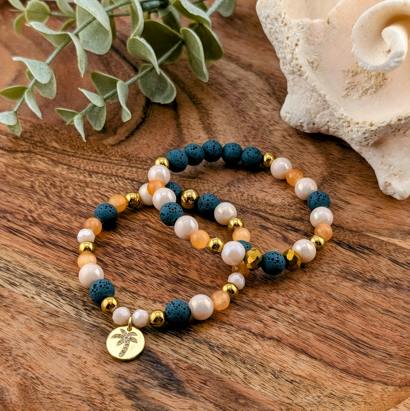Ce duo de bracelet est fait de sélenite orangé 6mm, de pierres d'acier inoxydable or et de pierres volcanique émeraude 8mm. Un des bracelets est orné d'une joli breloque de palmier.