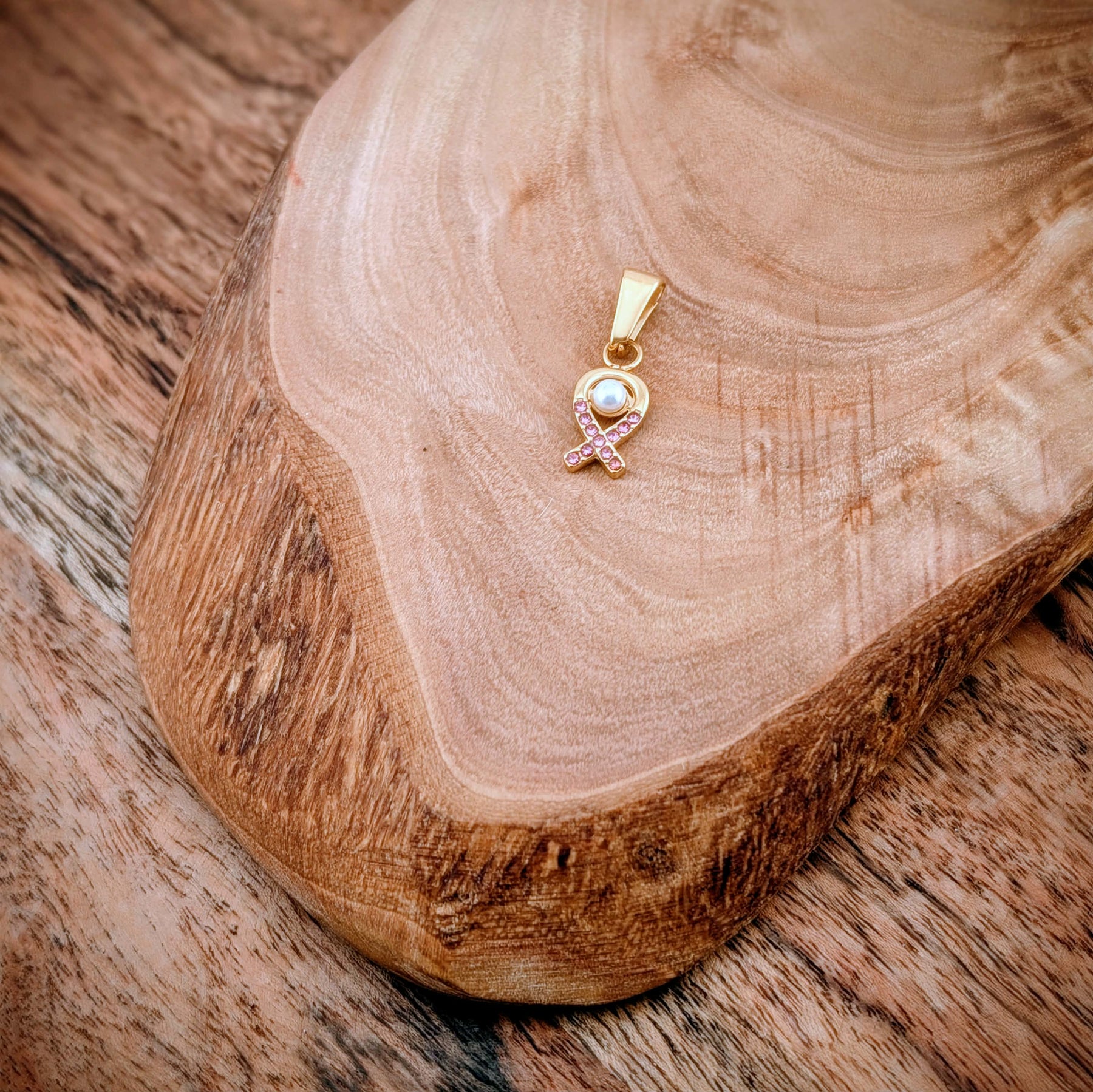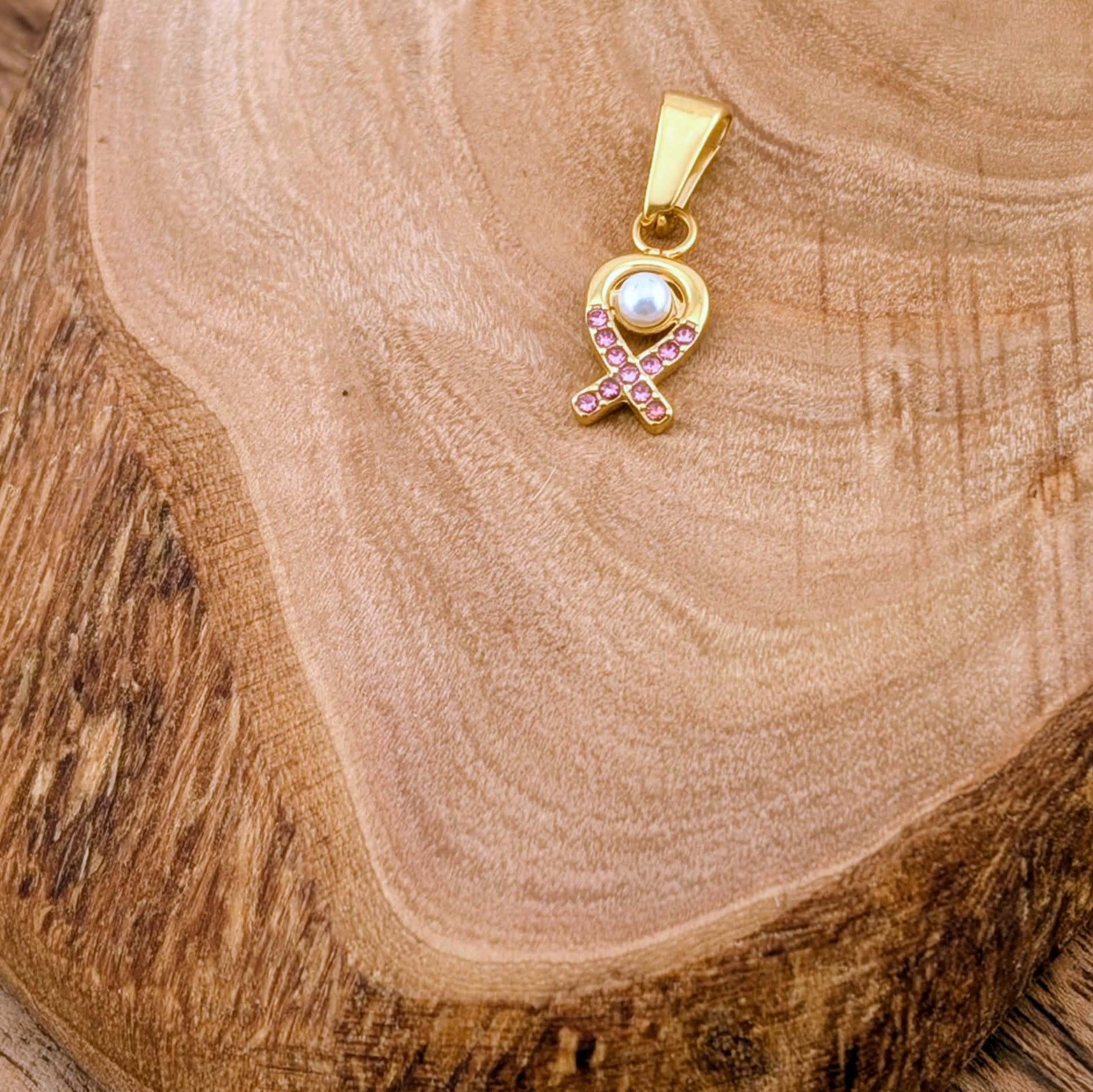 Médaillon ruban rose avec de petits zircon rose base en acier inoxydable.