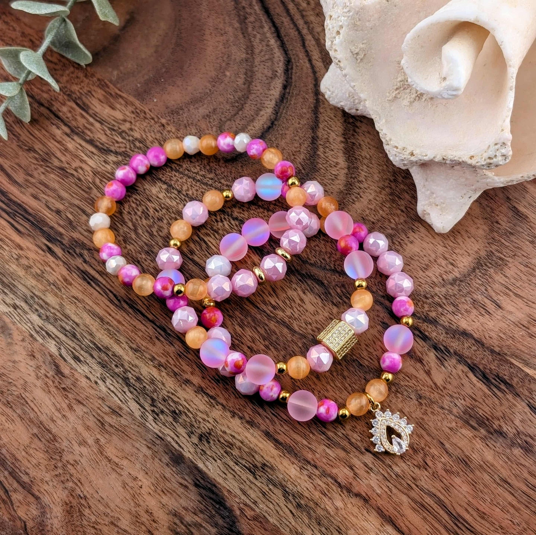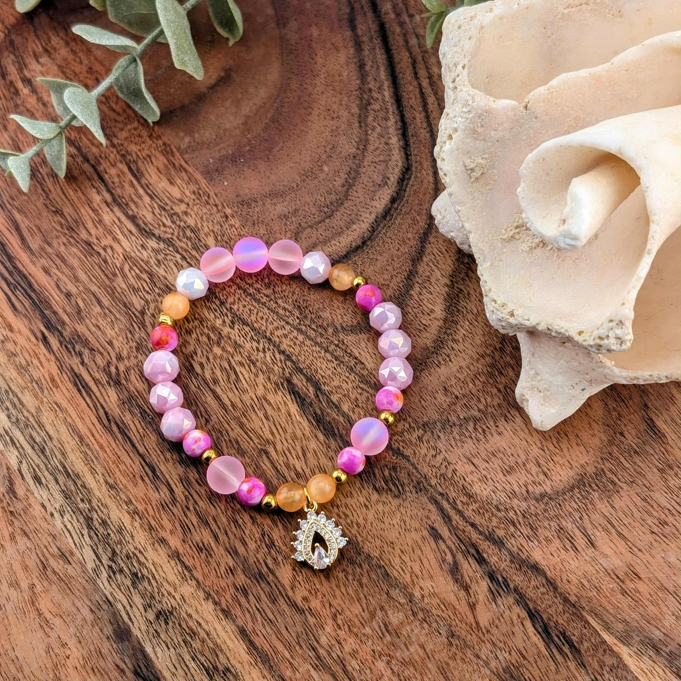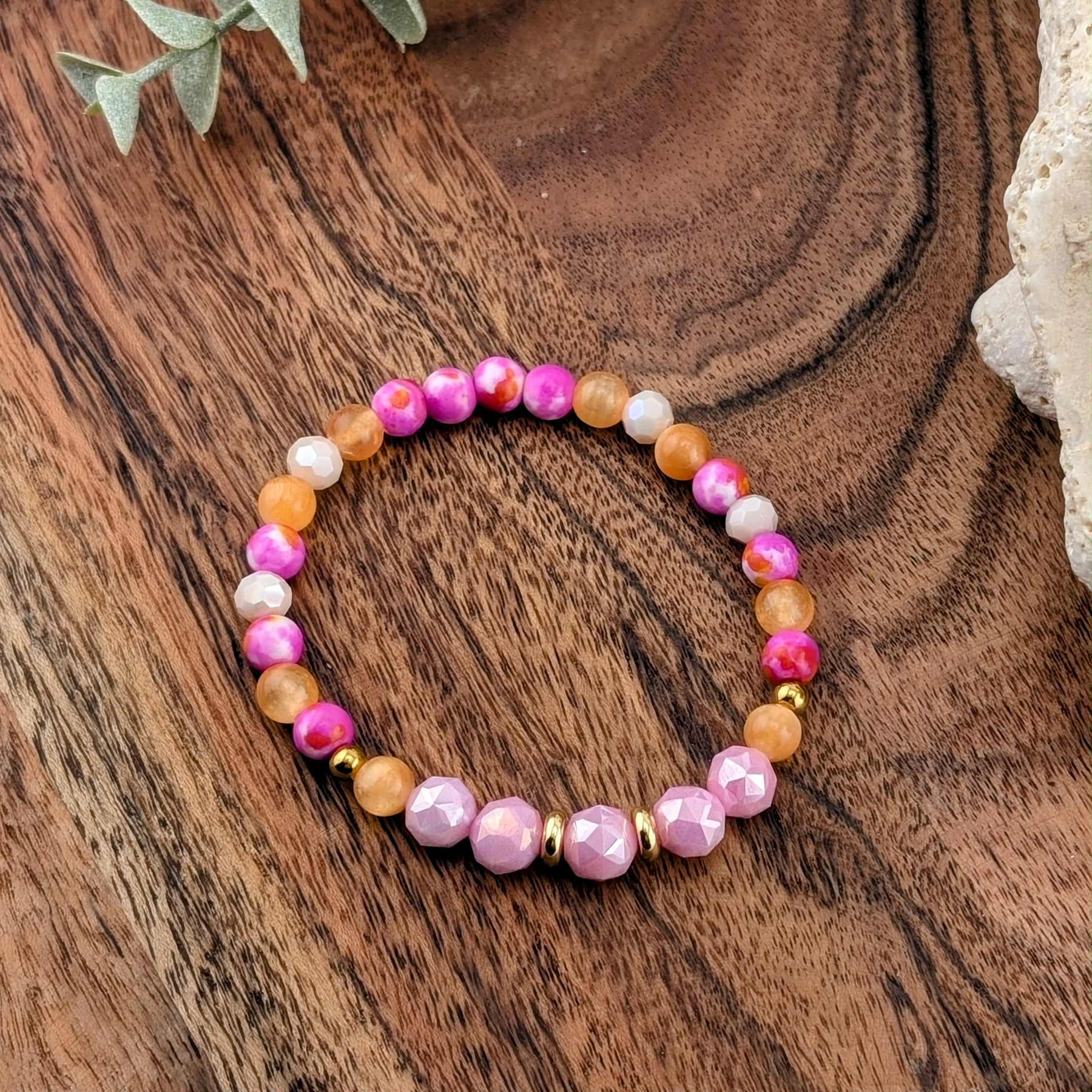Bracelet faits de pierres semi-précieuses 6mm de jade rainbow flower rose, blanc et orangé avec de la sélénite pêche orangé et de belles perles rose facetté. Les petites pierres or sont faites d'acier inoxydable et la breloque brillante est de bonne qualité.